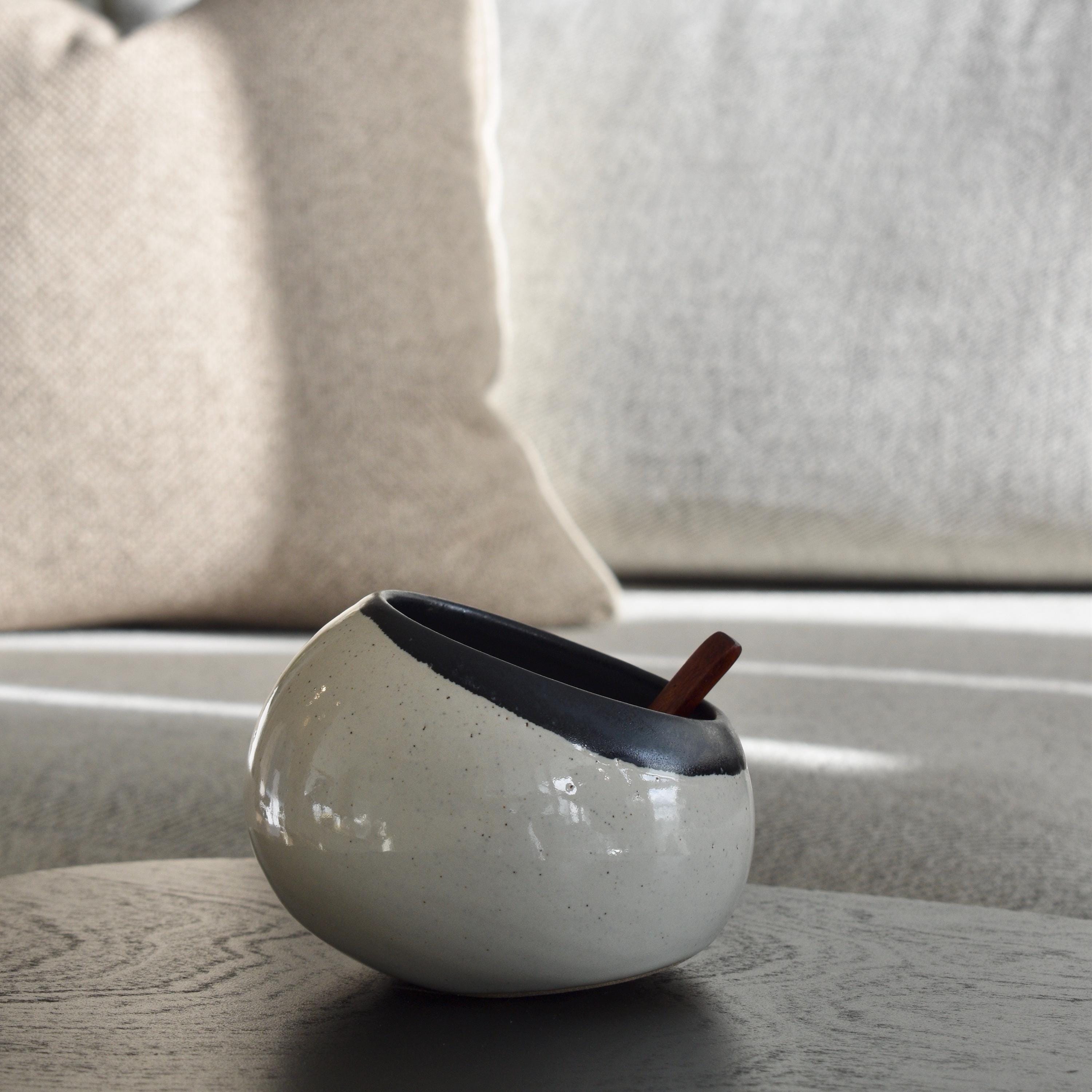 With its soft white exterior and matte black interior, this salt cellar is a classic, neutral piece with a modern feel. It’s a sweet, useful little dish made to live beside the stove or on the table - always ready for a pinch of salt.