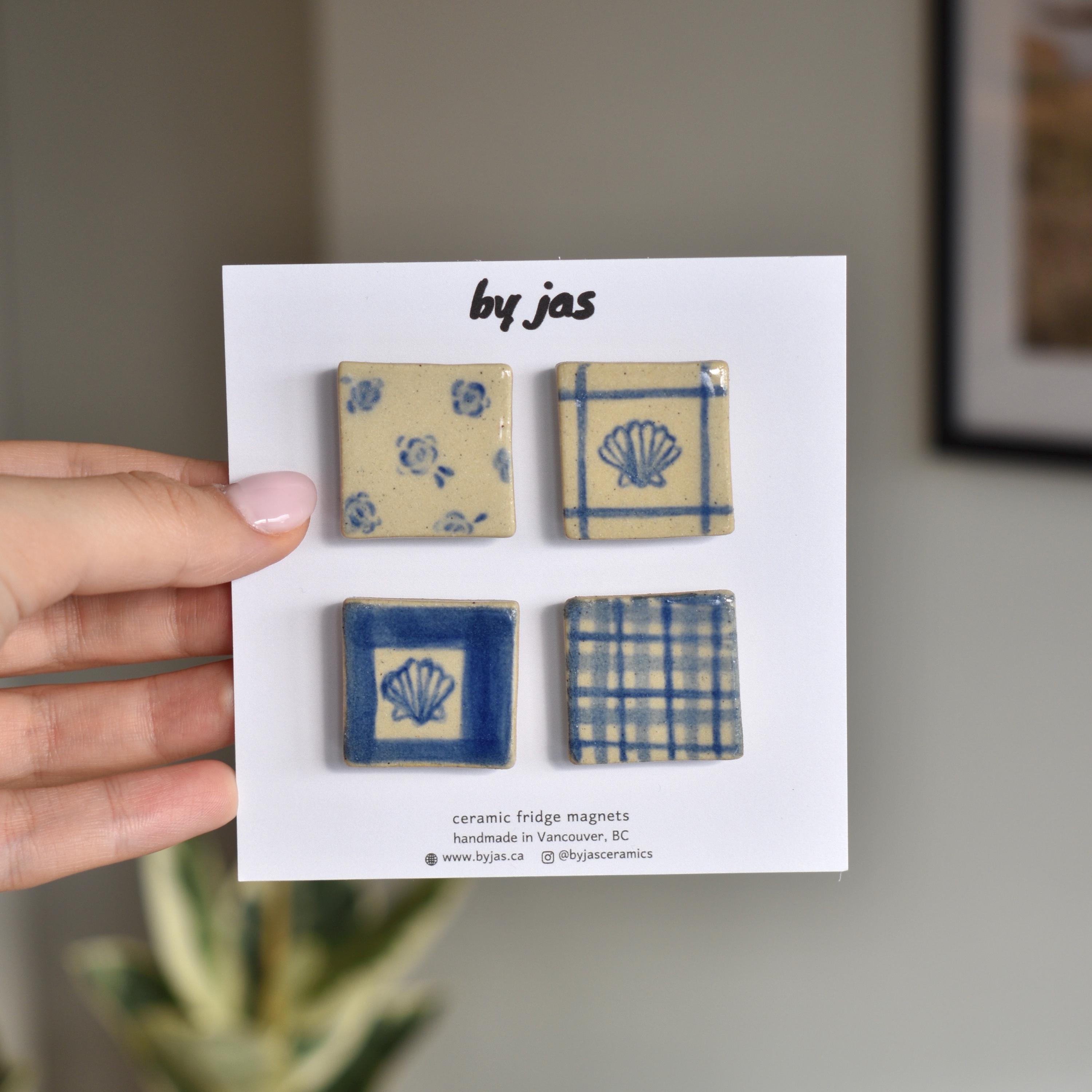 This set of 4 handmade, hand-painted ceramic magnets draws inspiration from classic blue-and-white ceramics. Designed to bring a cozy, timeless feel to your home, with strong magnets to securely hold your notes and keepsakes.