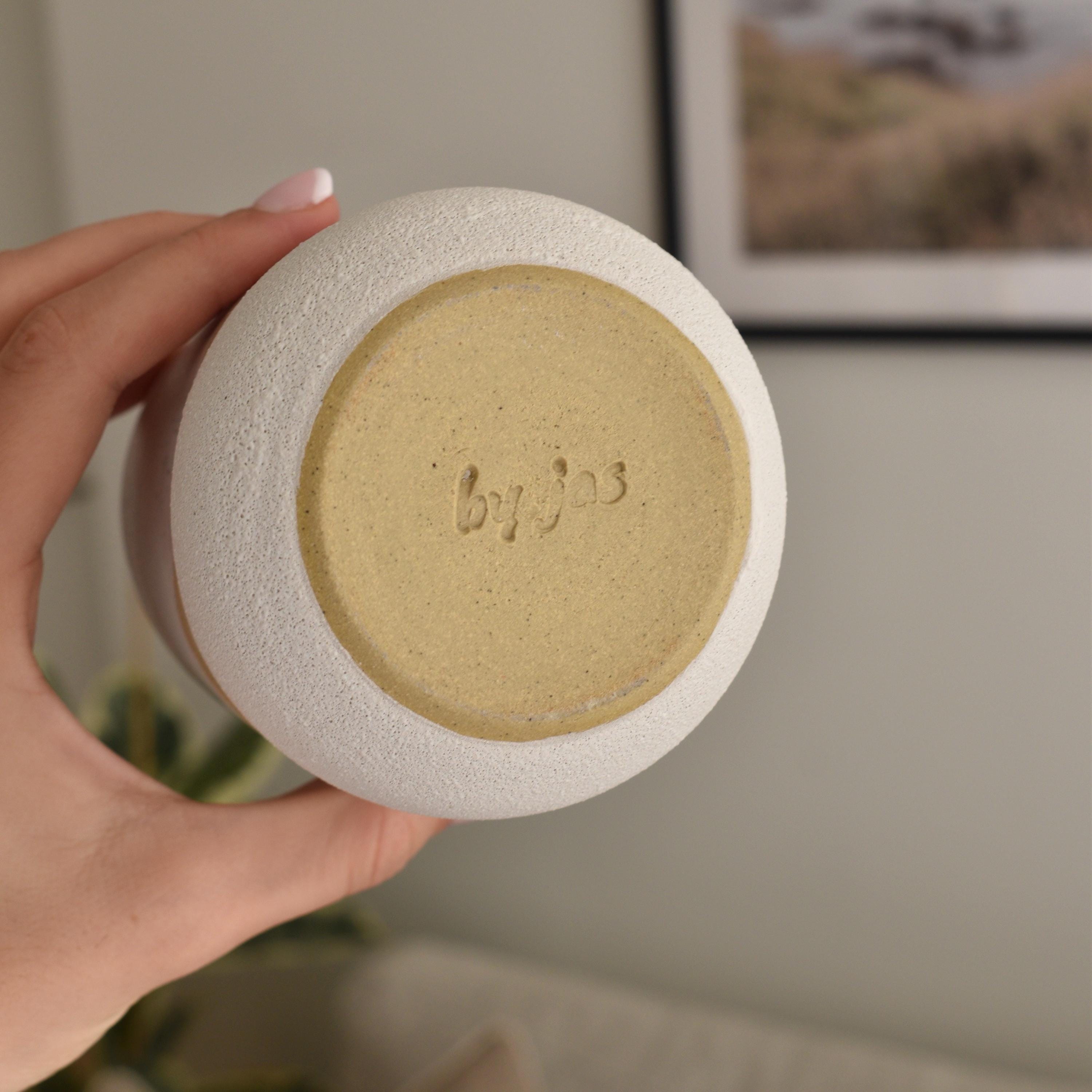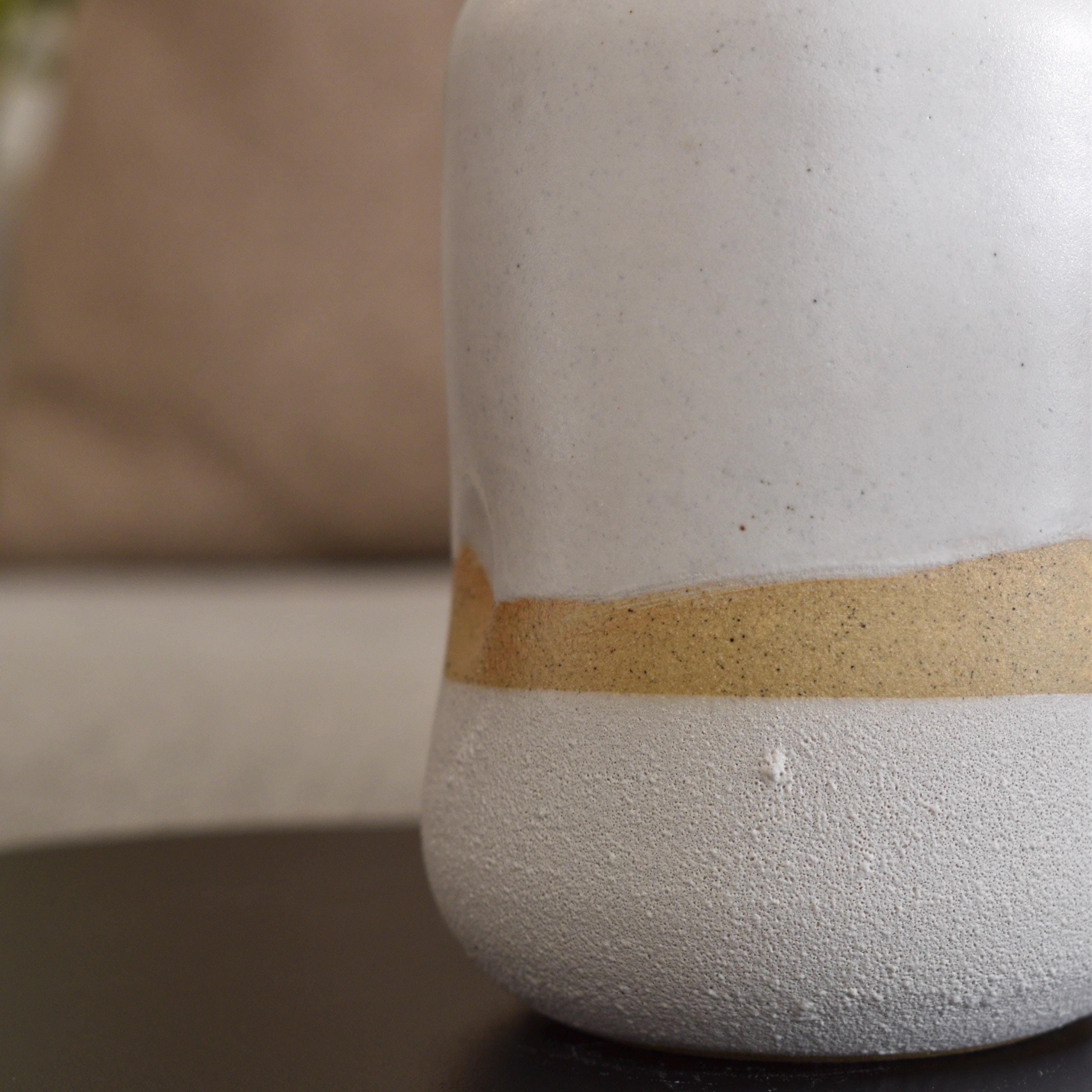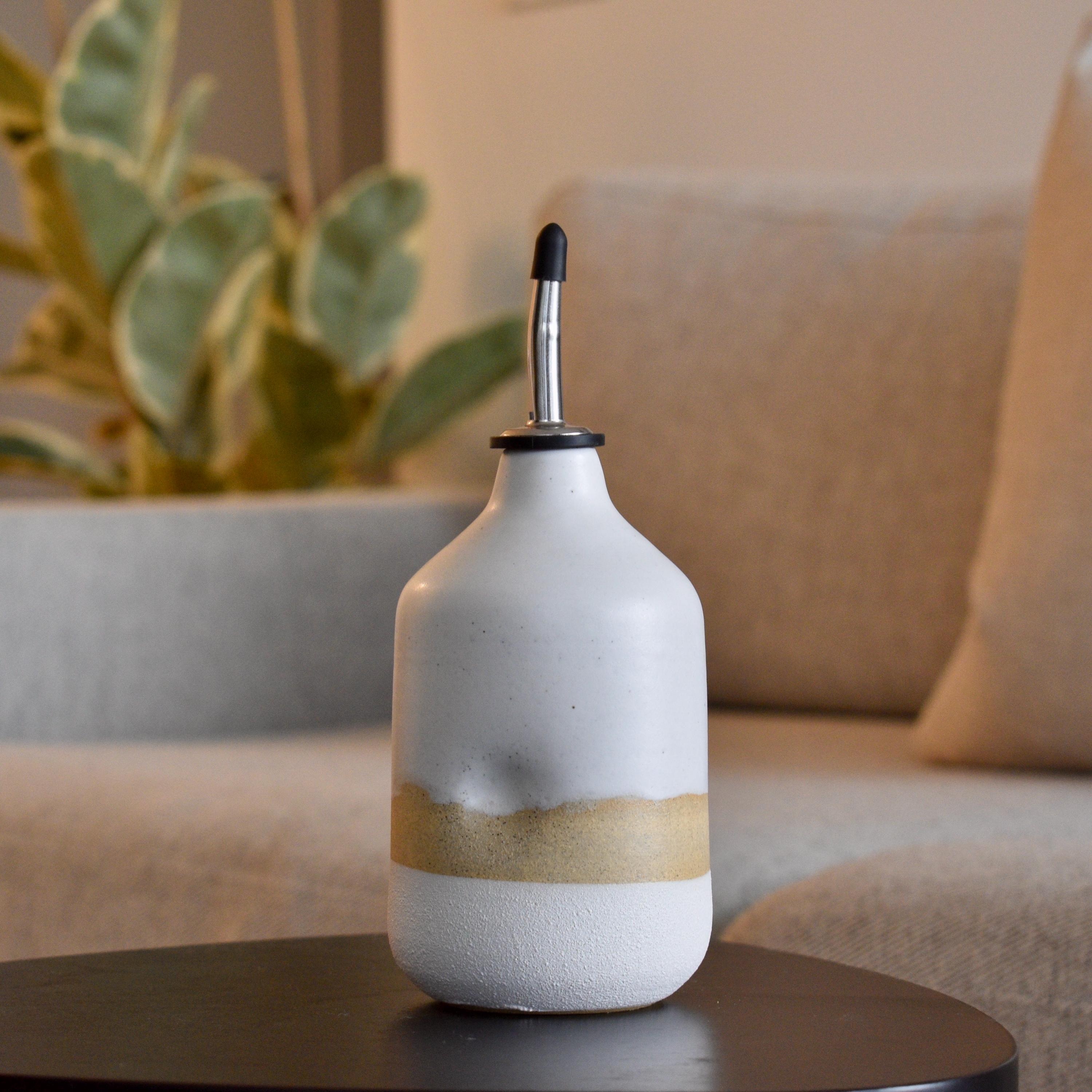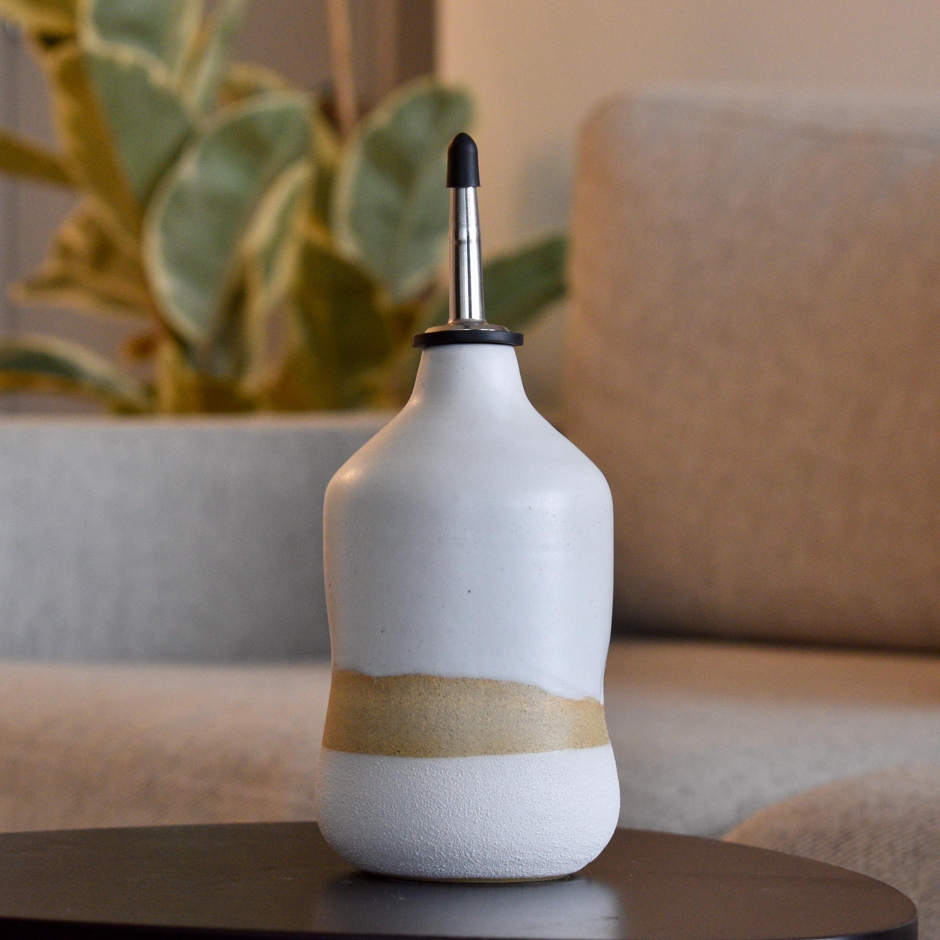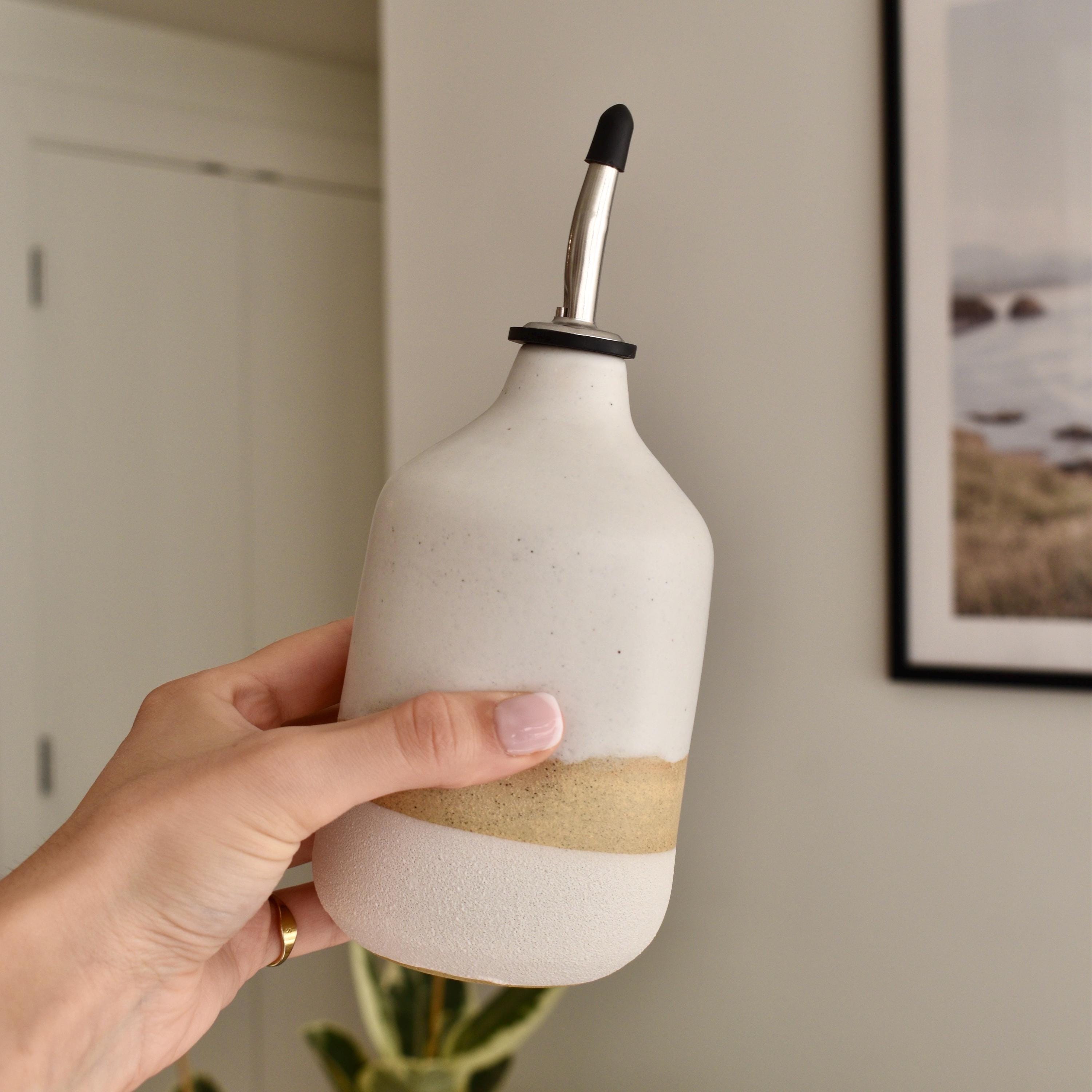 This hand-thrown soft white cruet pairs clean lines with a textured base and warm clay details, creating a piece that feels both modern and comforting. Designed with subtle finger indents for an easy hold, it’s a functional, beautiful addition to your everyday cooking.