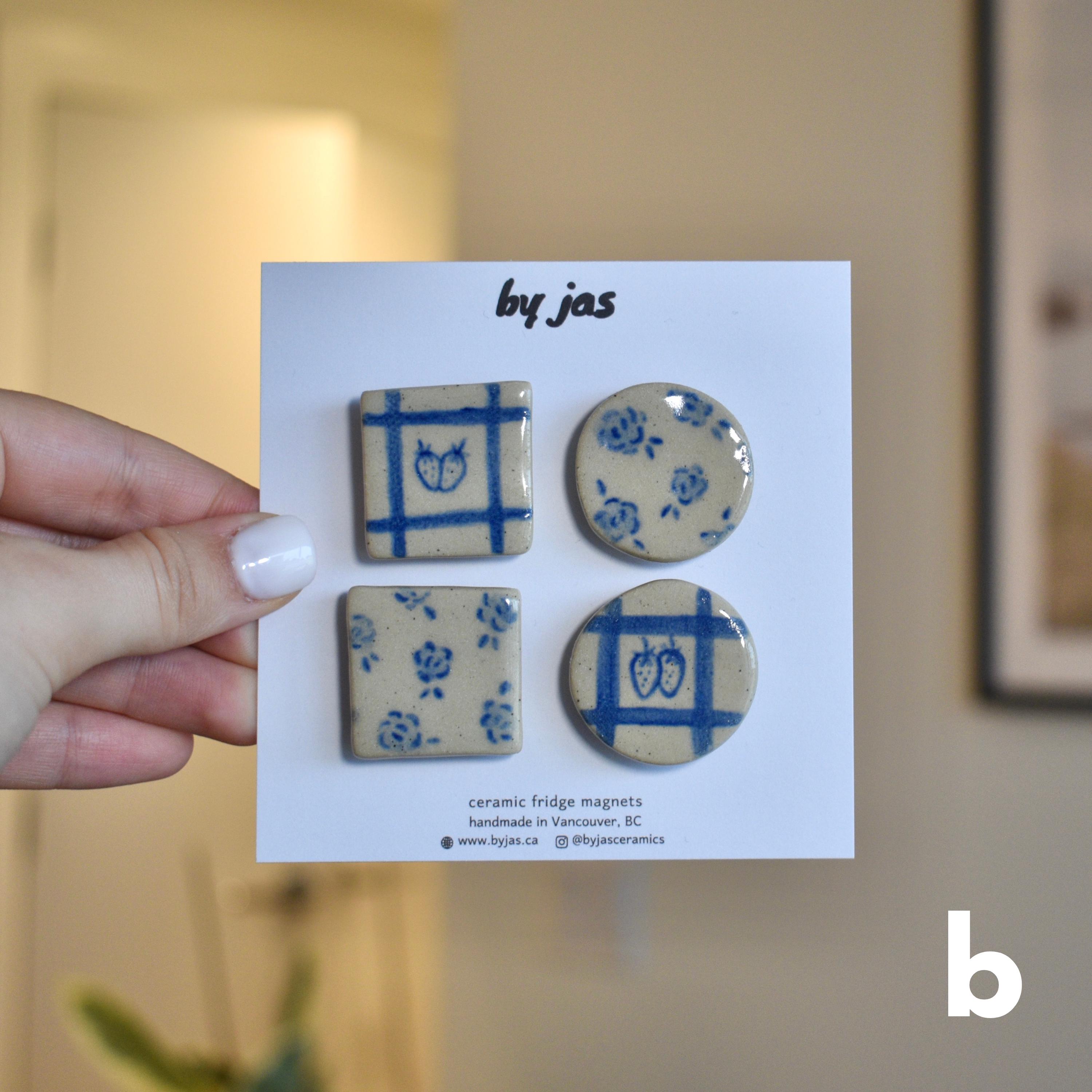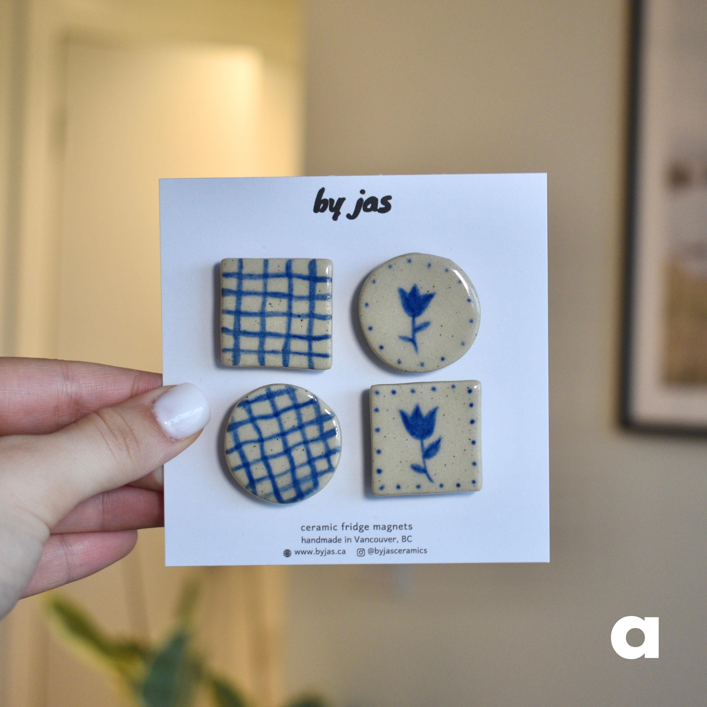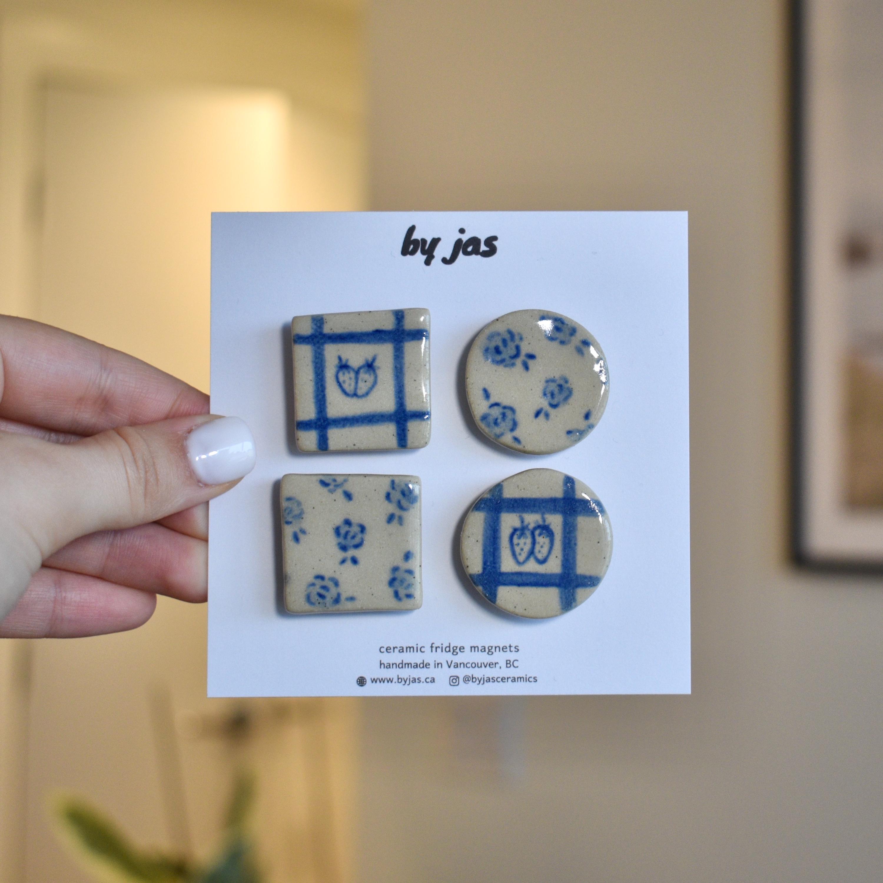 This set of 4 handmade, hand-painted ceramic magnets draws inspiration from classic blue-and-white ceramics. Designed to bring a cozy, timeless feel to your home, with strong magnets to securely hold your notes and keepsakes.